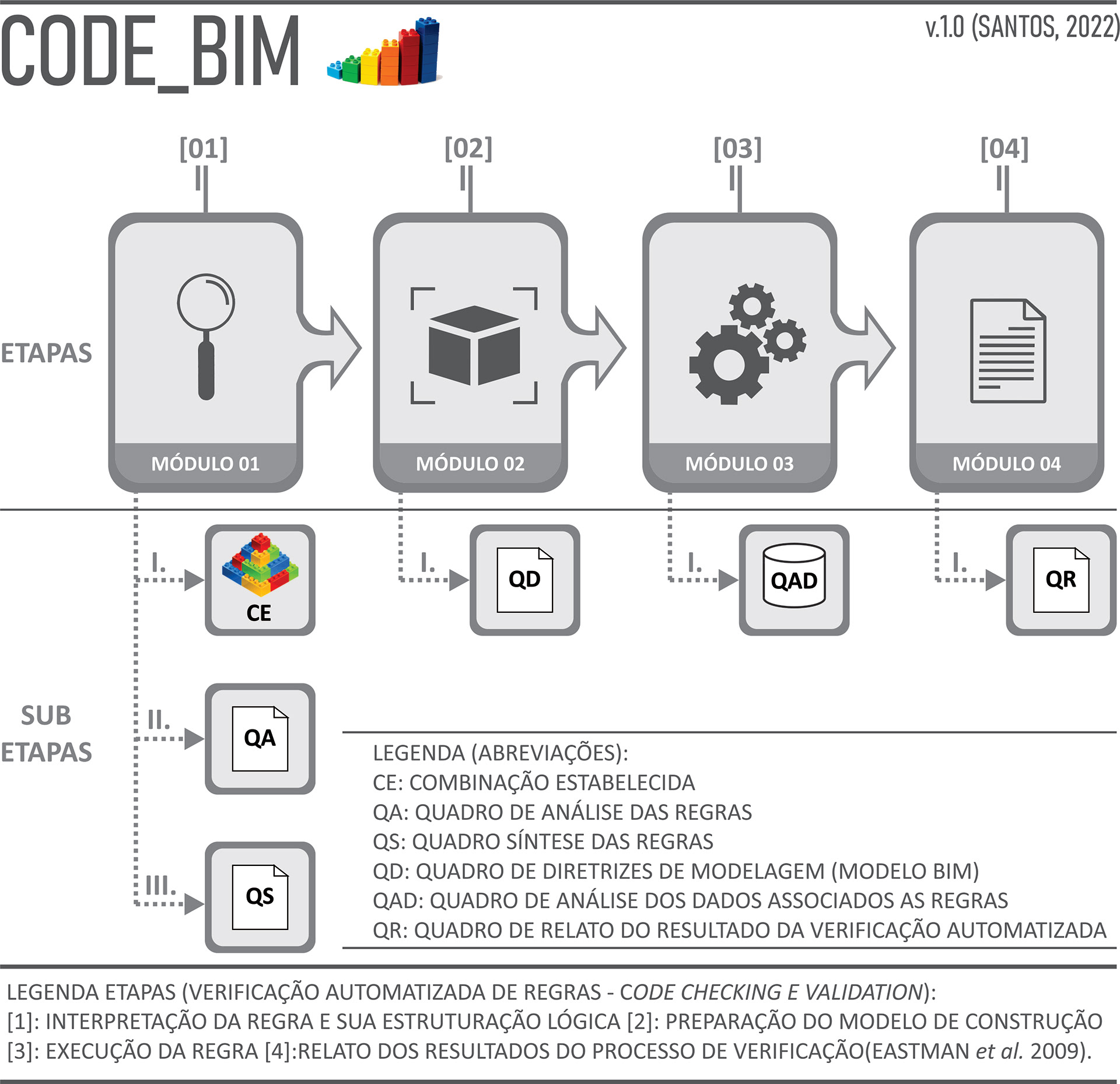 O CODE_BIM trata-se de um modelo conceitual inspirado em um jogo de "LEGO" possuindo uma lógica de montagem flexível e adaptável visando estruturar o uso BIM associado ao Code Checking e Validation (Succar, 2015) abrangendo as informações mínimas necessárias para realizar a verificação automatizada de regras em projetos, compreendendo como os dados associados ao modelo BIM devem ser organizados, correlacionados e apresentados para serem implementados em um processo de avaliação automatizada.