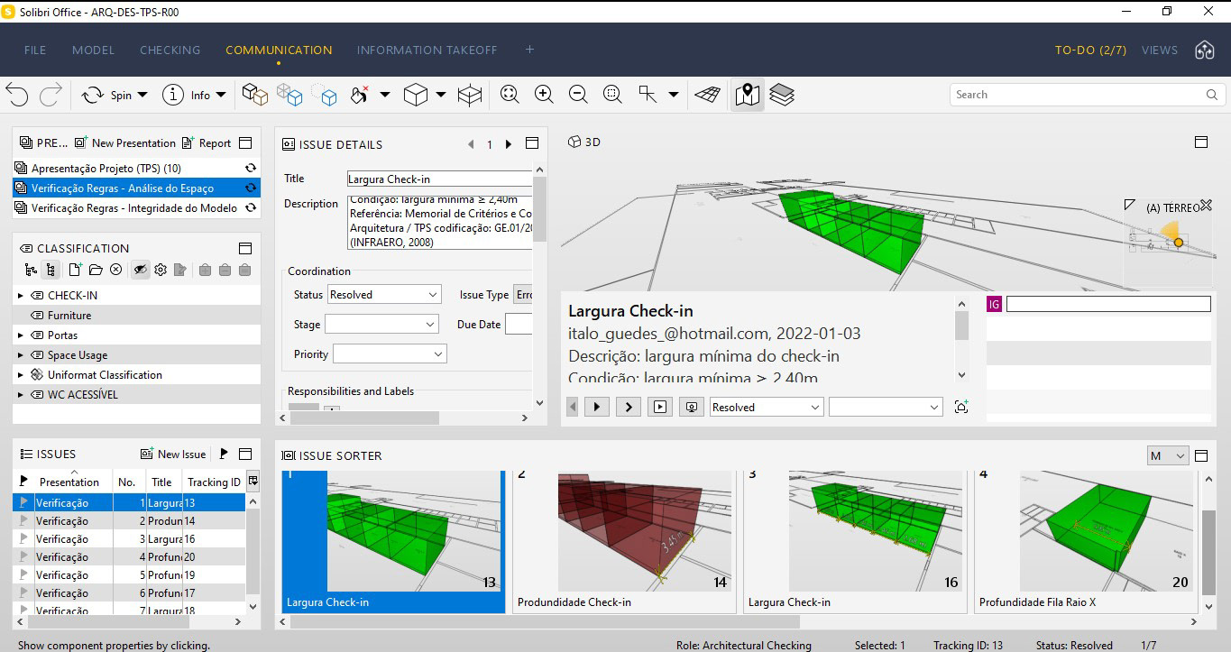 É importante salientar que o formato escolhido para compartilhamento do relatório de verificação automatizada de regras tem a ver com o protocolo estabelecido pela equipe de analistas, dependendo da estratégia estabelecida pelo órgão competente por analisar os projetos, poderá ser escolhido outros tipos de formatos ou até mesmo uma combinação híbrida do QR considerando mais de um formato de saída. A figura apresentada abaixo demonstra um vídeo criando o relatório de verificação automatizada na plataforma BIM Solibri Model Checker e imagens do relatório de verificação exportado através de um arquivo BIM Collaboration Format (BCF) aberto no aplicativo BIM Collab Cloud.