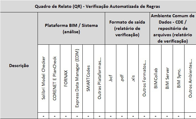 Uma vez criado o QAD é possível seguir para o módulo 04 associado a subetapa I denominado Quadro de Relato do resultado (QR) associado ao resultado obtido após a realização da verificação automatizada das regras. Este quadro deverá ser preenchido pela equipe de analista, uma vez que serão os analistas responsáveis por emitirem o relatório de verificação automatizada de regras, neste quadro, os analistas irão definir qual Plataforma BIM (análise) será utilizada, assim como, de que maneira o relatório será compartilhado com a equipe de projetistas, seja formato BIM Collaboration Format (BCF), Portable Document Format (PDF), XLS, dentre outros formatos. A imagem apresentada abaixo caracteriza o QR.
