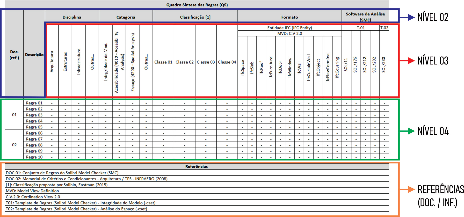 Uma vez criado os QA associado as regras a serem utilizadas no processo de Code Checking e Validation é possível desenvolver o Quadro Síntese (QS) que refere-se a um resumo de todas as regras criadas em um único quadro, conforme apresentado na imagem abaixo.
